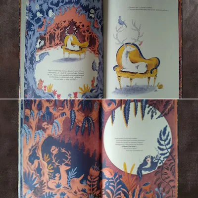 J'ai beaucoup aimé les illustrations, dans un style à la fois original et ancien, empruntant les codes de l'Art Nouveau et de l'Art Fantastique Allemand. Une grande richesse de motifs, offrant parfois un véritable cherche et trouve. Des animaux et des univers fantasmés, oniriques. La gamme de couleurs est surprenante au début, pour finalement sublimer le thème du livre, la beauté. Beauté de l'histoire, beauté du texte, beauté des illustrations, un vrai livre d'art.
