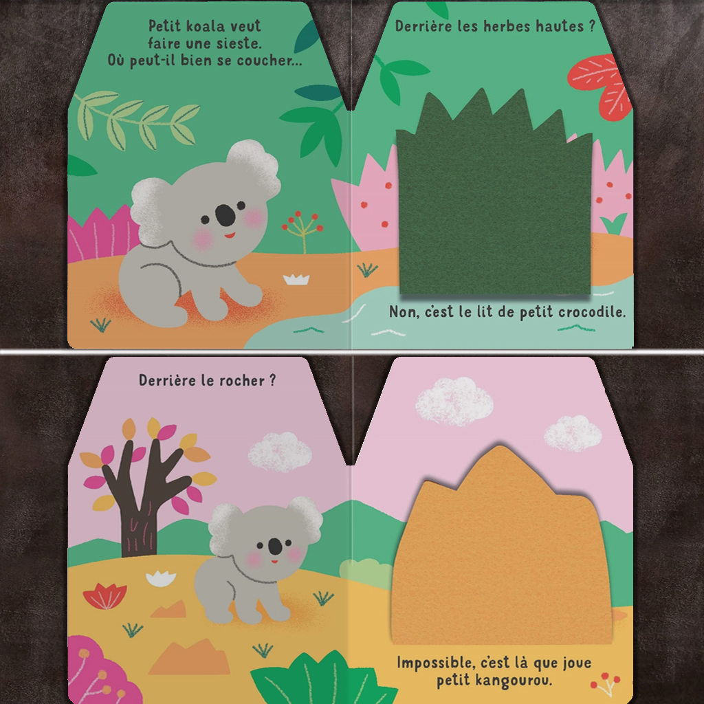Petit koala veut faire une sieste. Où peut-il bien se coucher... Derrière les herbes hautes ? Non, c'est le lit de petit crocodile. Derrière le rocher ? Impossible, c'est là que joue petit kangourou. Alors... derrière ce fruit ? Chuuuut, il ne faut pas déranger petite chauve-souris. Viens te coucher près de moi mon petit koala, chuchote maman. Et regarde dans ma poche...Ta petite sœur dort déjà !Un livre coucou/caché avec des flaps en feutrine et un petit koala, l'un des premier jeu que comprend le bébé.